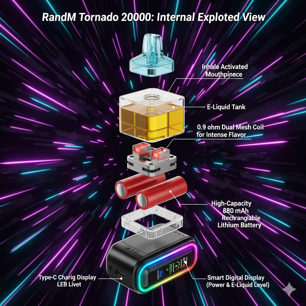 RandM Tornado 20000 integriert Hochleistungsakku, intelligenten Steuerchip, Mesh-Verdampferkopf, Liquidtank, optimiertes Luftstromsystem und ergonomisches Mundstück. Beim Ziehen aktiviert der Chip den Akku, der den Verdampfer gleichmäßig erhitzt, feinen Dampf erzeugt und über das Luftstromsystem zum Mundstück geleitet wird. Die Konstruktion gewährleistet stabile Verdampfung, kontinuierliche Liquidzufuhr, Schutz vor Dry Burns und langanhaltende Nutzung.